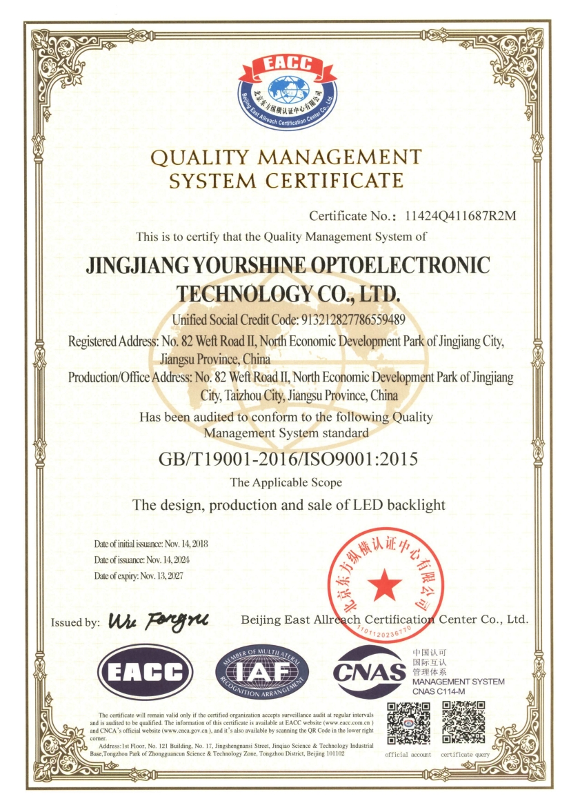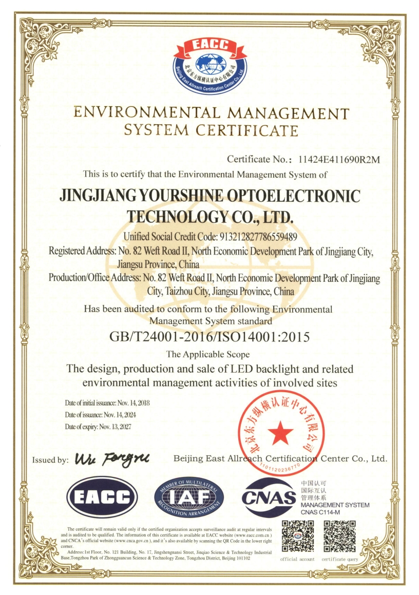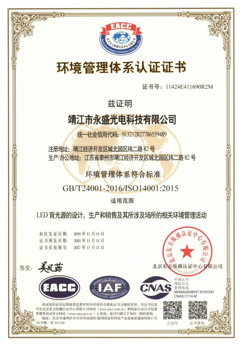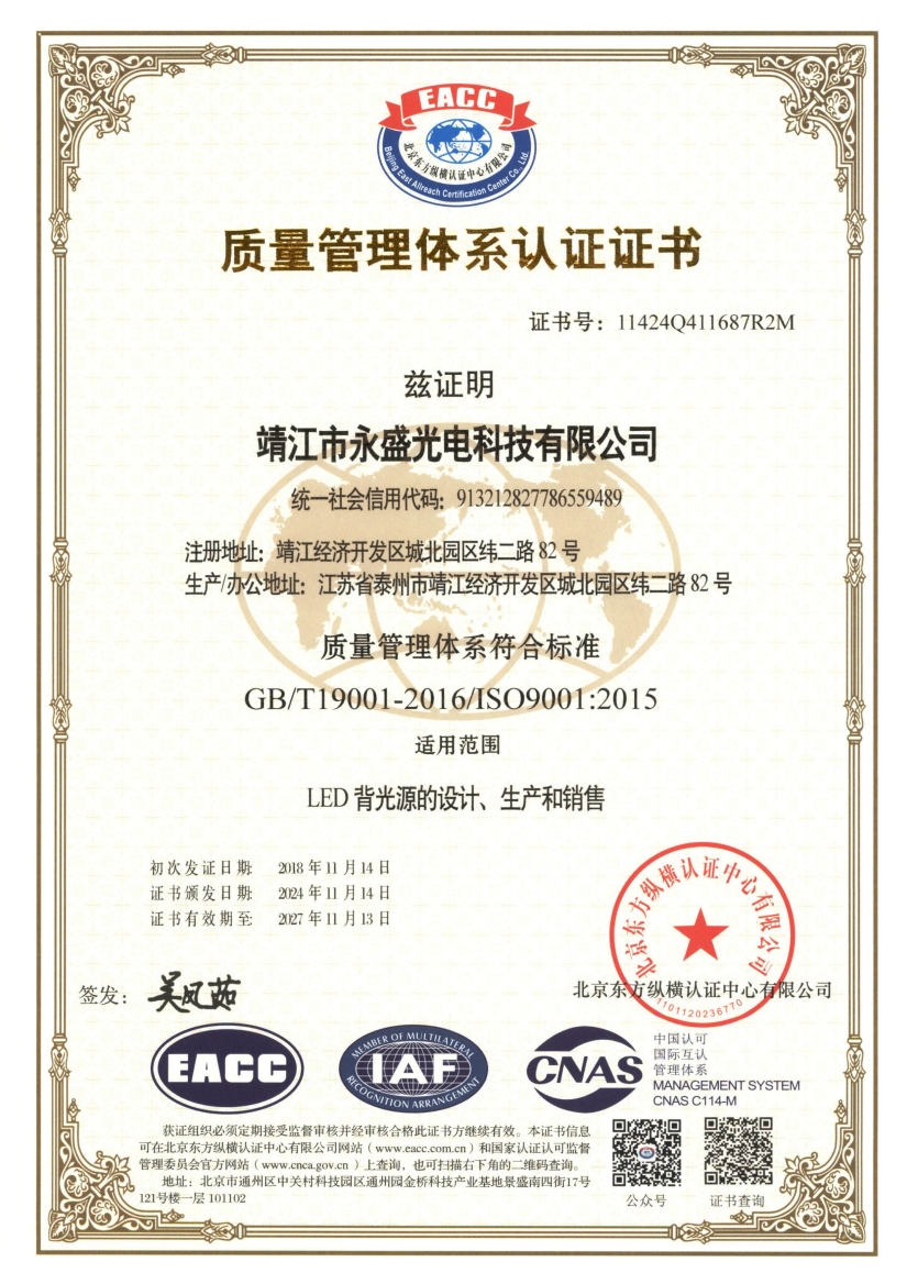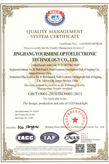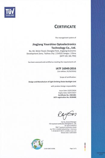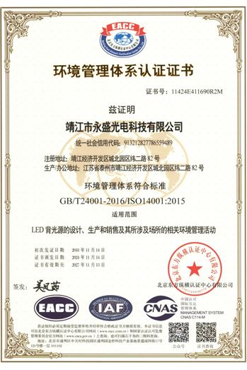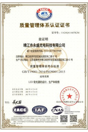 more永盛光電依托科技,強(qiáng)化管理,建立了完善的體系管理,分別通過(guò)了ISO9001、ISO14001、IATF 16949國(guó)際質(zhì)量體系認(rèn)證,為公司的長(zhǎng)足發(fā)展奠定了堅(jiān)實(shí)的基礎(chǔ)。